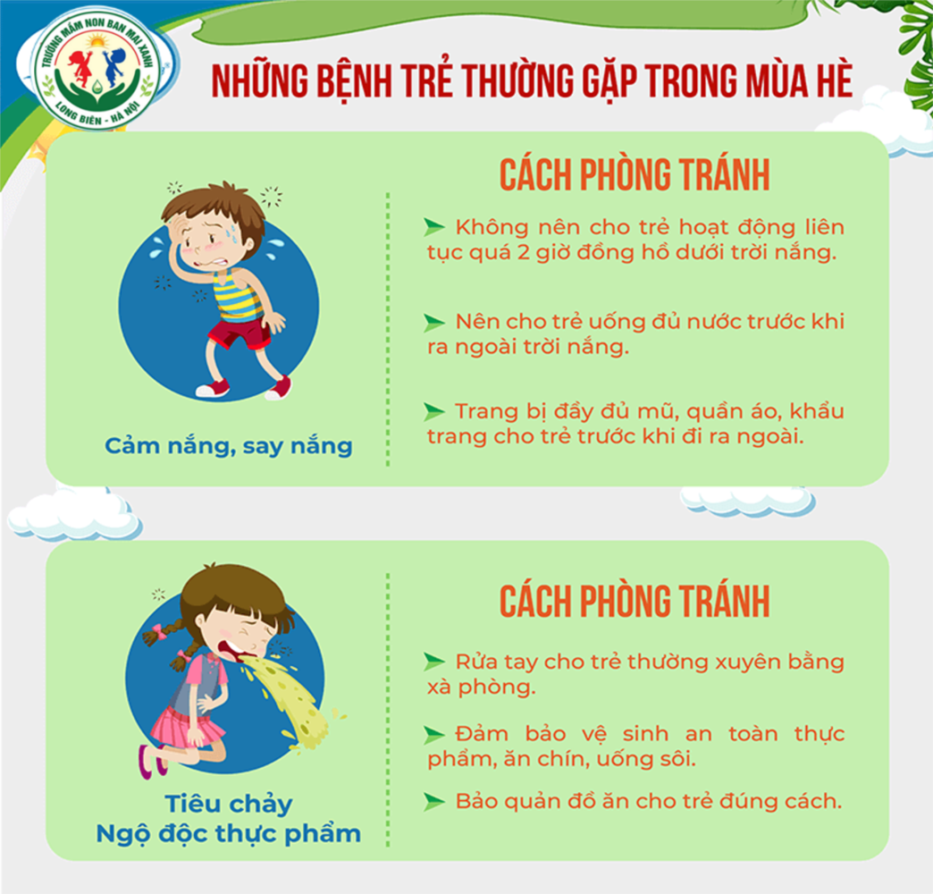 Nhằm giúp trẻ đề phòng bệnh tật, bên cạnh biện pháp tiêm ngừa đối với những loại bệnh có vaccine, bù đủ nước mất cho cơ thể, bổ sung vitamin từ trái cây, rau tươi để tăng cường sức đề kháng cho trẻ, bố mẹ cần lưu ý bảo vệ trẻ từ những việc nhỏ nhất như cho trẻ rửa tay sạch trước khi ăn và sau khi đi vệ sinh; ăn uống hợp vệ sinh, thực phẩm an toàn và được nấu chín, không ăn ngoài hàng quán; uống nước sạch và nguồn nước tắm rửa sạch. Nếu cho trẻ đi chơi mùa hè, bố mẹ cần cho bé ăn hàng quán sạch sẽ, hợp vệ sinh; uống nước đầy đủ (tránh nước đá lạnh); luôn giữ trẻ thoáng mát, khô thoáng (khi vui chơi ra nhiều mồ hôi thì nên lau khô người, thay quần áo mới).