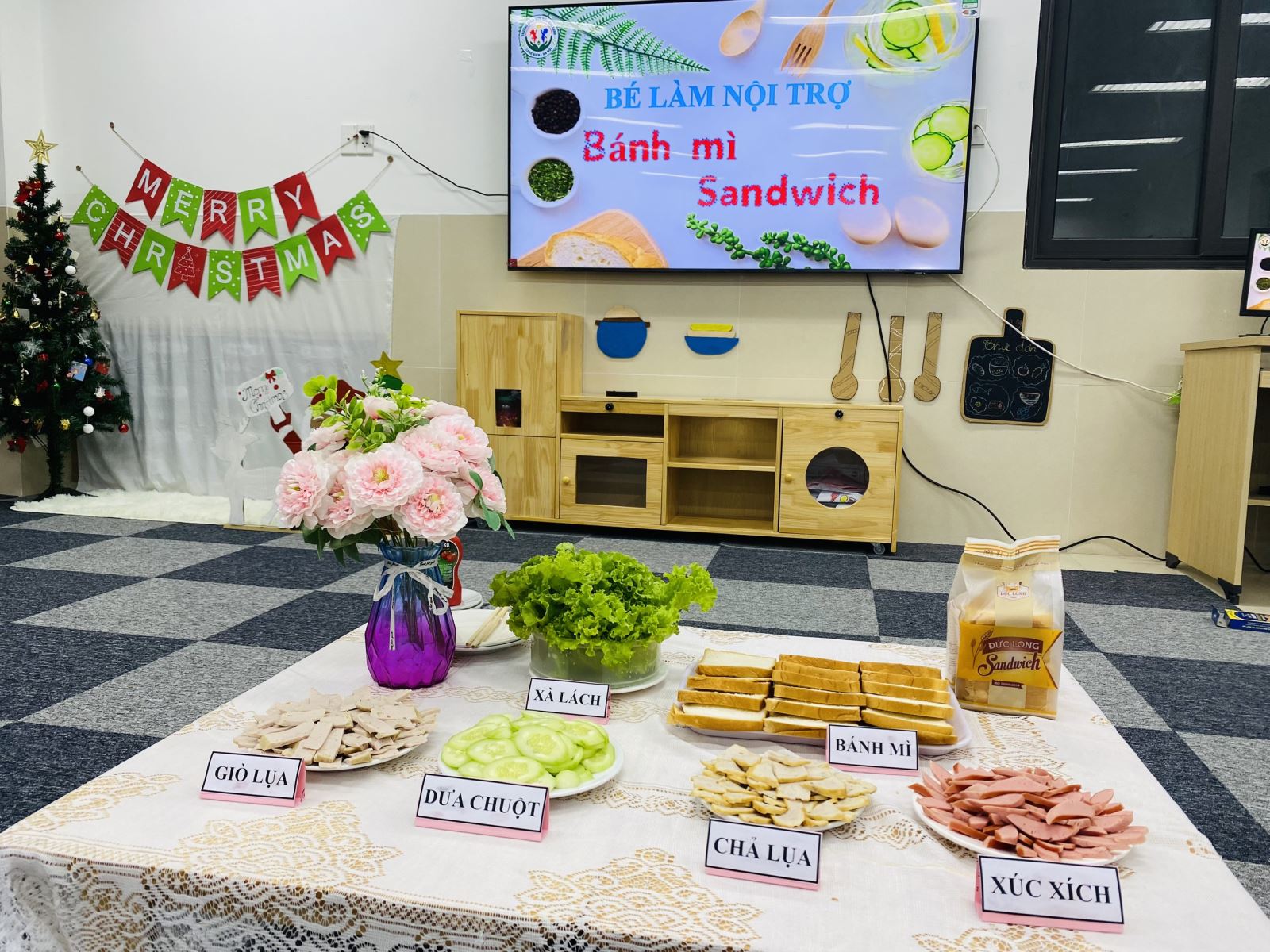 Hôm nay, các bạn nhỏ lớp mẫu giáo bé C4 được cô giáo hướng dẫn thực hành làm món bánh mỳ sandwich. Với những nguyên liệu đã được các cô chuẩn bị sẵn như: Xúc xích,giò lụa, dưa chuột..., bé tự tay làm những miếng bánh mì sandwich kẹp theo ý thích của mình. Những bàn tay nhỏ bé còn vụng về nhưng với sự hướng dẫn và động viên, khích lệ của cô giáo, các bé đã rất thích thú, tự tin thực hành cách dưa chuột, xếp xúc xích ... tạo nên những chiếc bánh mì kẹp thơm ngon.