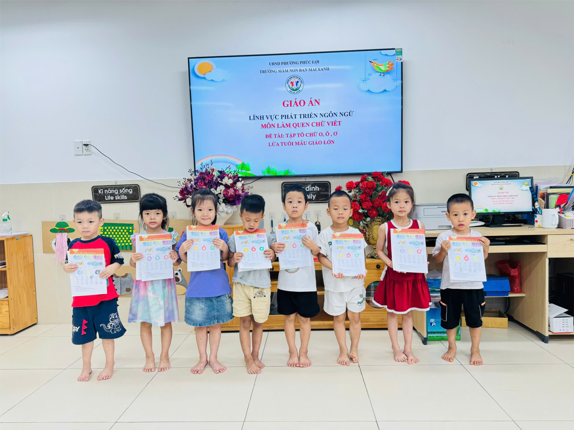 Trong giờ học tập tô chữ o, ô, ơ, các bé lớp mẫu giáo lớn A5 tỏ ra vô cùng hào hứng và chăm chú. Từng nét bút được các con luyện tập cẩn thận, thể hiện sự cố gắng và sự tập trung cao độ. Hoạt động không chỉ giúp trẻ rèn kỹ năng cầm bút, phát triển sự khéo léo của đôi tay mà còn tạo nền tảng vững chắc cho việc học viết sau này. Nhìn hình ảnh các con miệt mài tập tô, phụ huynh có thể cảm nhận rõ niềm vui và sự tiến bộ từng ngày của bé.
