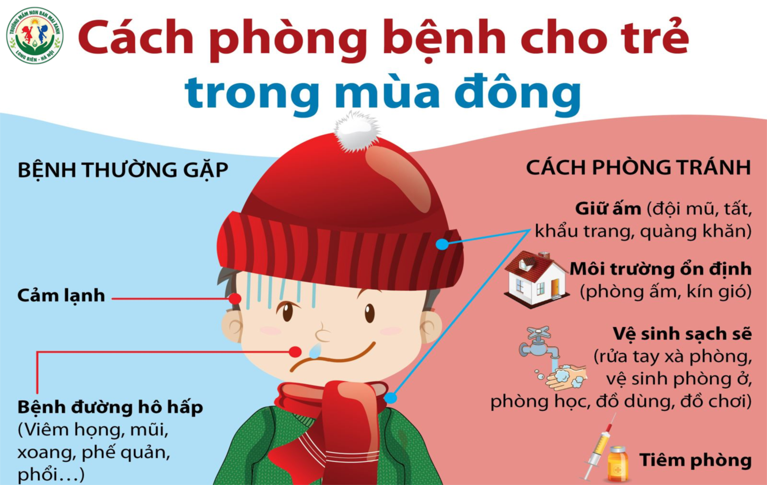 - Có nước nóng vệ sinh cho trẻ vào những ngày nhiệt độ xuống thấp. Cho trẻ tập thể dục sáng và hoạt động ngoài trời muộn hơn, Hạn chế cho trẻ ra ngoài trời vào những ngày nhiệt độ thấp.