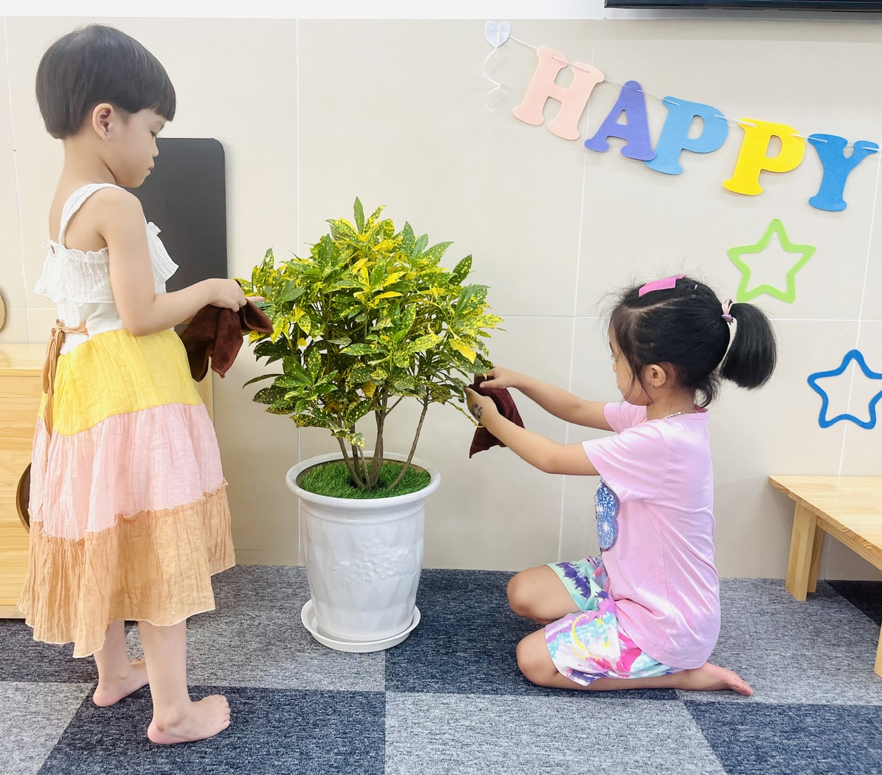 Hoạt động lao động vệ sinh, nhặt lá, lau lá cây của trẻ mẫu giáo lớn A2 Trường mn Ban Mai Xanh.