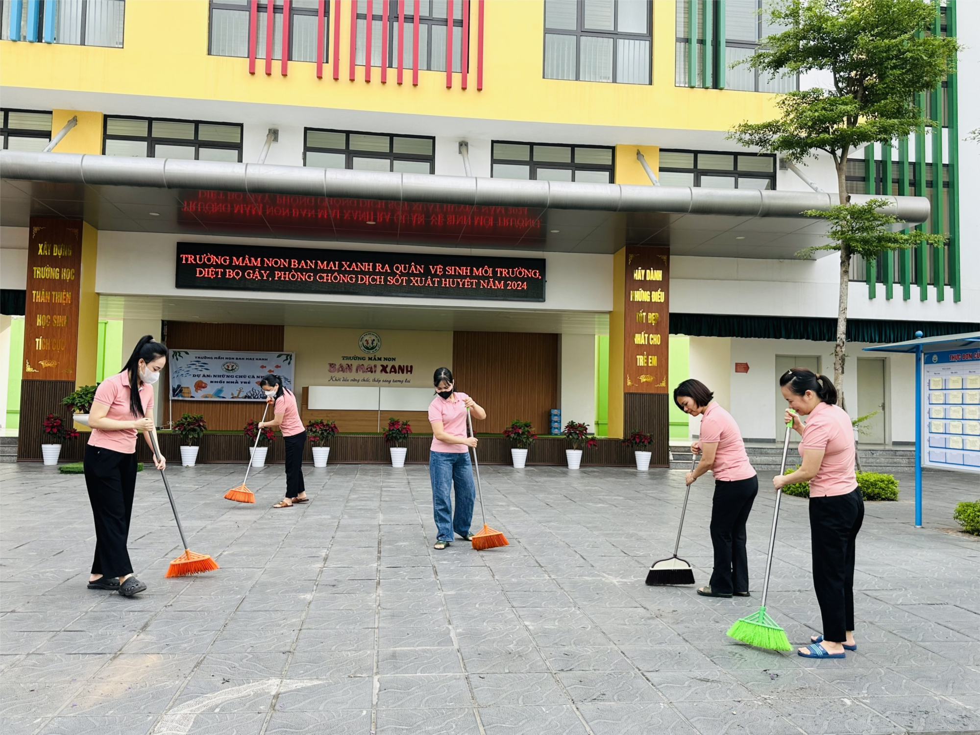 Nâng cao nhận thức, ý thức trách nhiệm của CBGVNVvề công tác phòng, chống bệnh Sốt xuất huyết gây ra, nhằm bảo vệ sức khỏe cho bản thân và cộng đồng. Ngày 11 tháng 5 năm 2024, Trường mầm non Ban Mai Xanh đã chủ động triển khai tổng vệ sinh môi trường và khử khuẩn theo chỉ đạo của UBND Quận và cơ quan y tế,. Chú trọng trong công tác vệ sinh môi trường, khơi thông cống rãnh, lật úp không để nước đọng, thông thoáng phòng học, lau chùi bàn ghế, các khu vực phòng học, phòng làm việc, khu vực nhà ăn, vệ sinh đồ dùng, đồ chơi, các công trình vệ sinh và các khu vực, đồ dùng khác theo đúng theo kế hoạch số 91/KH-UBND ngày 5/2/2024 cảu UBND quận Long Biên về phòng chống Sốt xuất huyết tren địa bàn Quận năm 2024. Thực hiện Kế hoạch số 122/KH-UBND ngày 4/5/2024 về triển khai tổng vệ sinh môi trường. diệt bọ gậy, phòng chống dịch Sốt xuất huyết.