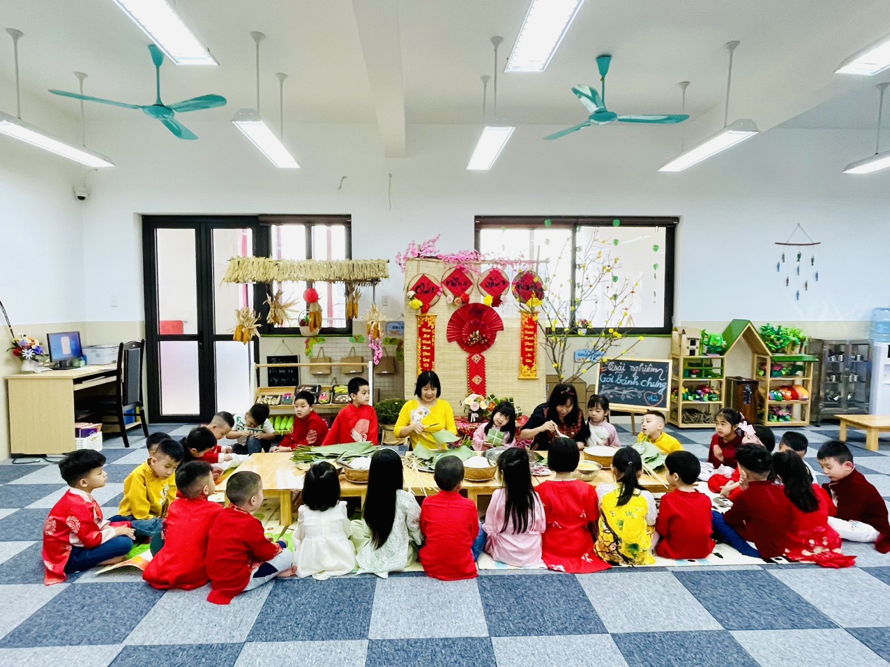 Trước khi bắt tay vào làm, các bé được cô giáo kể cho nghe câu chuyện "Sự tích bánh chưng" và hướng dẫn đầy đủ các bước làm. Bé nào cũng được tự tay gói chiếc bánh chưng của mình. Các bé tỏ ra rất thích thú và hào hứng khi được học hỏi thêm về phong tục Tết cổ truyền của dân tộc, tự tay làm một món ăn truyền thống đặc trưng của ngày Tết.