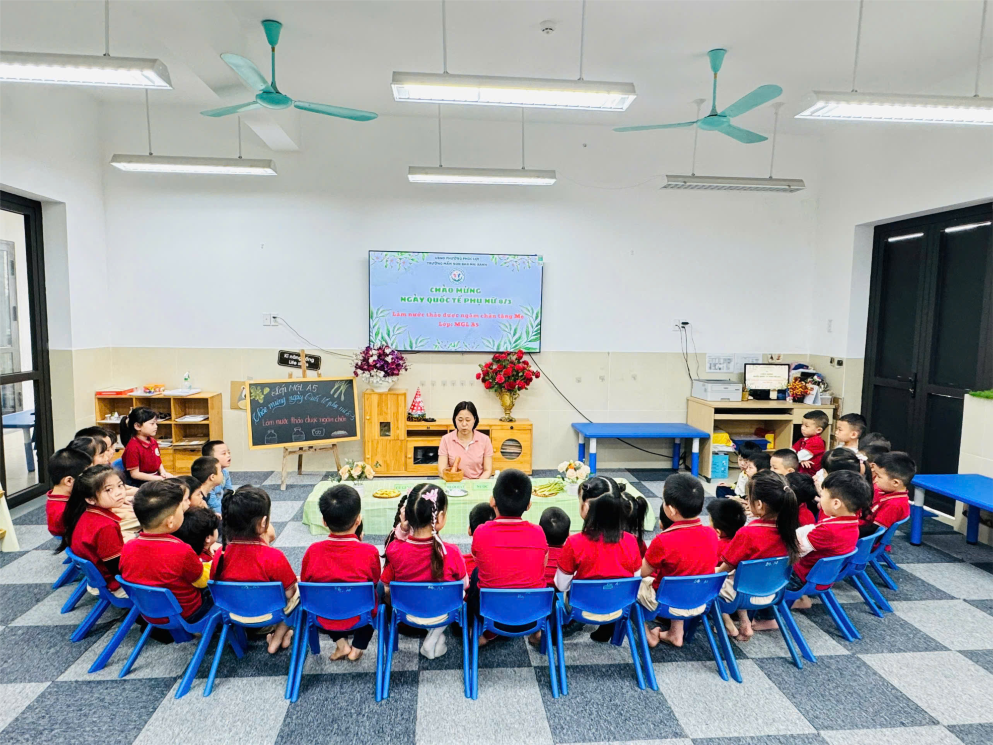 Nhân dịp 8/3, các bé lớp mẫu giáo lớn đã cùng nhau chuẩn bị một món quà thật đặc biệt dành tặng mẹ – Làm nước ngâm chân thảo dược tặng mẹ từ những nguyên liệu quen thuộc như củ gừng, củ sả tươi, muối hạt và nước. Dưới sự hướng dẫn của các cô, các con đã cùng nhau giã nhỏ gừng, xả trong cối. Những tiếng chày giã rộn ràng hòa cùng tiếng cười thích thú làm không khí lớp học thêm ấm áp. Sau khi giã xong, các bé khéo léo dùng thìa múc từng thìa gừng, sả và muối hạt cho vào chai, ánh mắt chăm chú và đầy tự hào. Từng chiếc chai nhỏ xinh chứa đựng hương thơm dịu nhẹ của gừng sả và cả tình yêu thương ngây thơ, trong sáng mà các con muốn gửi đến mẹ nhân ngày Quốc tế Phụ nữ 8/3.