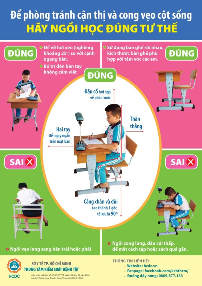 - Tạo cho trẻ tư thế ngồi học ngay ngắn, ở nơi có đủ ánh sáng, bàn ghế phù hợp với lứa tuổi, chiều cao của trẻ. Trẻ ngồi thoải mái, không bị nhô vai lên hay hạ vai xuống. Trọng lượng cặp sách không nên vượt quá 15% trọng lượng cơ thể, đeo đều hai vai, tránh đeo lệch về một phía.