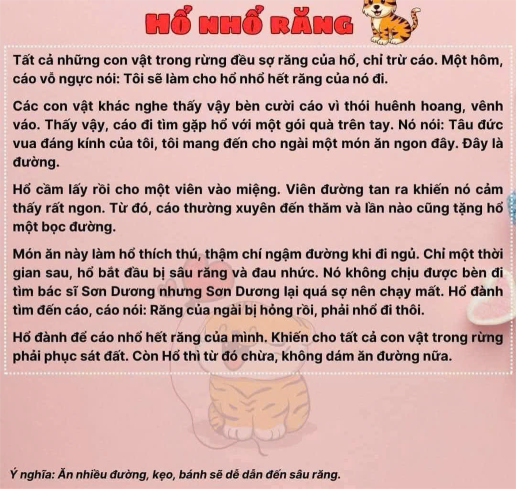 Răng của ngài bị hỏng rồi, phải nhổ đi thôi.Hổ đành để cáo nhổ hết răng của mình. Dù không còn răng nữa nhưng hổ vẫn rất cảm kích cáo.