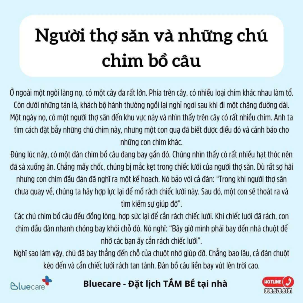 Đúng lúc này, có một đàn chim bồ câu đang bay gần đó. Chúng nhìn thấy có rất nhiều hạt thóc nên đã sà xuống ăn. Chẳng mấy chốc, chúng bị mắc kẹt trong chiếc lưới của người thợ săn. Dù rất sợ hãi nhưng con chim đầu đàn đã nghĩ ra một kế hoạch. Nó bảo với cả đàn: “Trong khi người thợ săn chưa quay về, chúng ta hãy hợp lực lại để mổ rách chiếc lưới này. Sau đó, một con sẽ thoát ra và tìm kiếm sự giúp đỡ”.