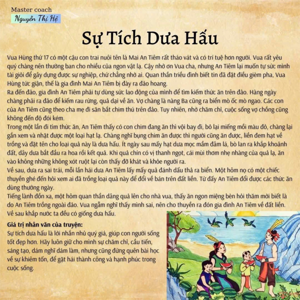 Truyên: Sự tích quả dưa hấuNgày xưa, thời vua Hùng Vương, đất nước ta có núi cao, có sông rộng, trời đẹp nắng vàng, nhưng đồng ruộng thưa thớt, hoa quả chưa có nhiều thứ thơm ngọt như bây giờ. Vua Hùng Vương thứ mười bảy có một người con nuôi là An Tiêm có tài tháo vát và có trí hơn người.