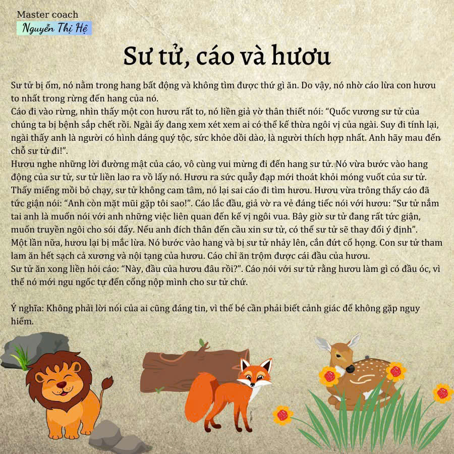 Cáo đi vào rừng, nhìn thấy một con hươu rất to, nó liền giả vờ thân thiết nói: “Quốc vương sư tử của chúng ta bị bệnh sắp chết rồi. Ngài ấy đang xem xét xem ai có thể kế thừa ngôi vị của ngài. Suy đi tính lại, ngài thấy anh là người có hình dáng quý tộc, sức khỏe dồi dào, là người thích hợp nhất. Anh hãy mau đến chỗ sư tử đi!”.