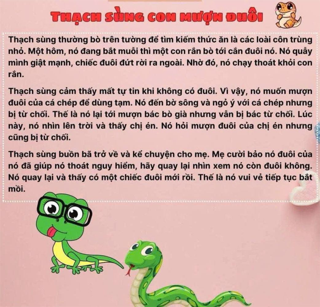 Thạch sùng buồn bã trở về và kể chuyện cho mẹ. Mẹ cười bảo nó đuôi của nó đã giúp nó thoát nguy hiểm, hãy quay lại nhìn xem nó còn đuôi không. Nó quay lại và thấy có một chiếc đuôi mới rồi. Thế là nó vui vẻ tiếp tục bắt mồi.