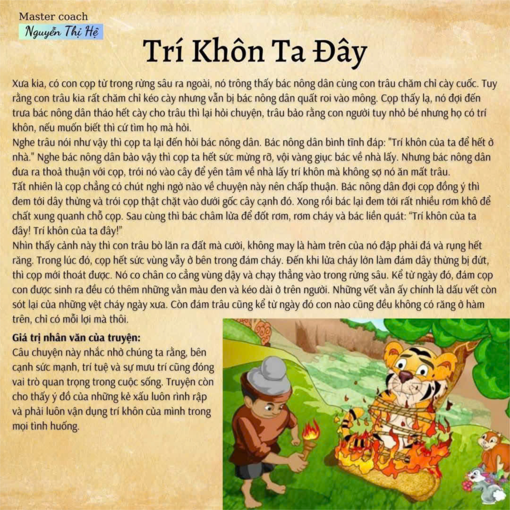 Anh nông dân suy nghĩ hồi lâu mới nói với hổ rằng “Trí khôn của ta đang để ở nhà đấy. Nếu ngươi cần thì ta có thể cho ngươi một ít”. Cọp nghe đến đó thì vui mừng và giục anh nông dân quay về nhà lấy. Nhưng anh nông dân như sực nhớ ra điều gì và hỏi cọp “Nếu ta đi về nhà, ngươi lại tranh thủ ăn mất trâu của ta thì sao?”.
