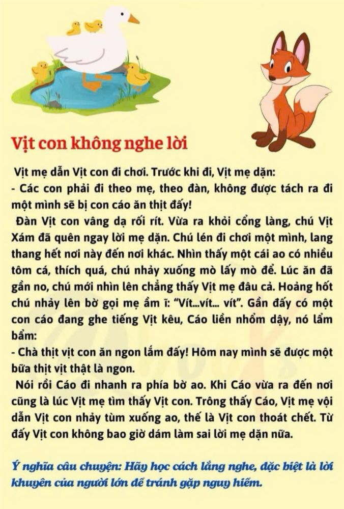 Vịt mẹ dẫn Vịt con đi chơi. Trước khi đi, Vịt mẹ dặn: