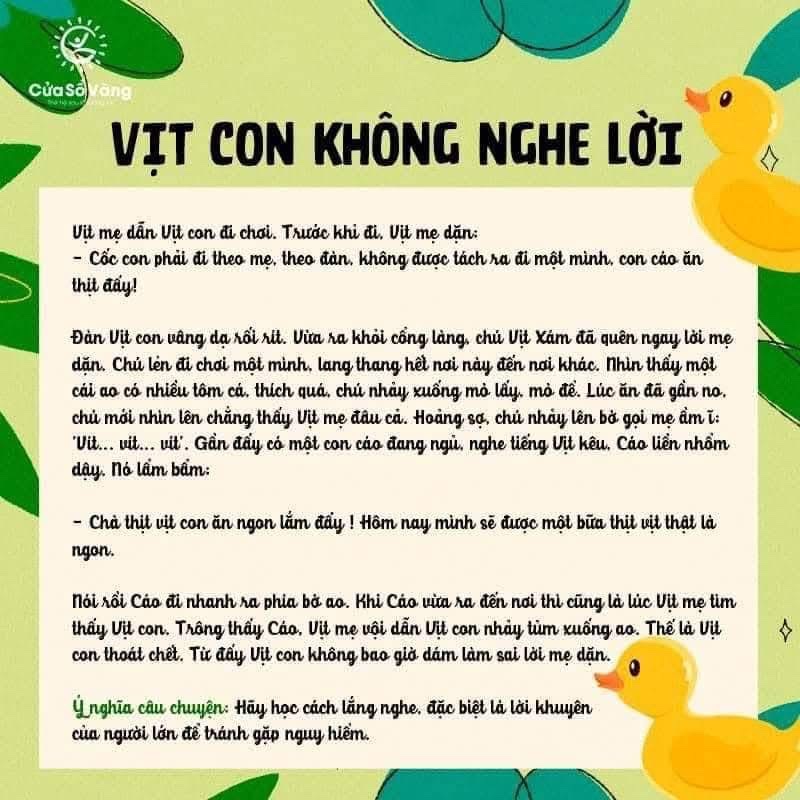 Vịt mẹ dẫn Vịt con đi chơi. Trước khi đi, Vịt mẹ dặn:
