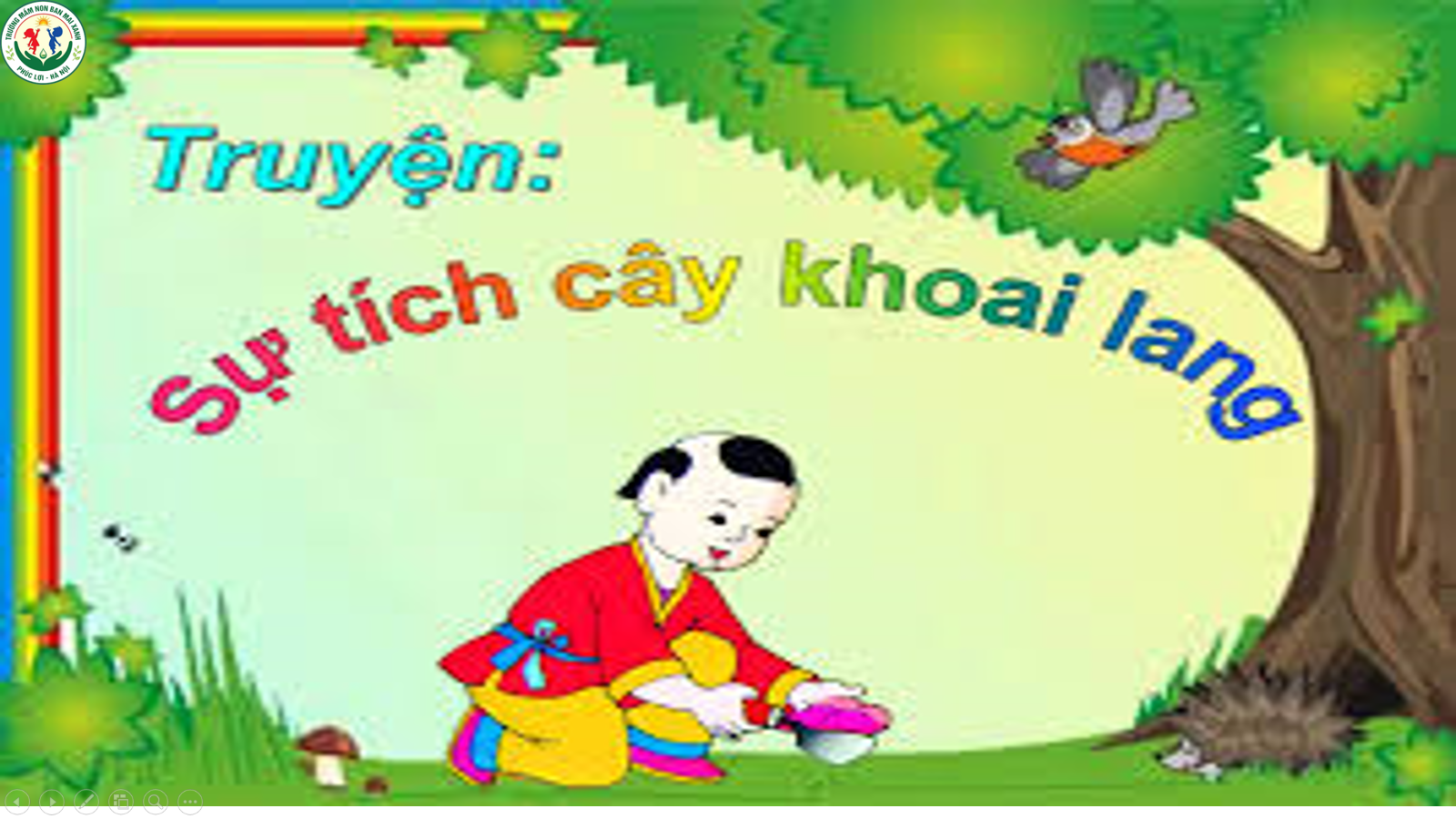 -Bà ơi, bây giờ cháu đã lớn. Từ nay trở đi, cháu sẽ đi kiếm củi, đổi lấy thóc giống và cấy lúa để nâu cơm cho bà ăn. Ăn củ mài mãi thì khổ lắm !Từ đó, cậu bé cày cấy và chăm chút cho nương lúa của mình. Nhìn cây lúa trổ bông, rồi chín vàng, cậu sung sướng nghĩ: “Thế là bà sắp được ăn cơm trắng rồi !”Nhưng chẳng may, một hôm, cả khu rừng bị cháy. Nướng lúa cũng bị cháy thành tro. Cậu bé buồn quá, bưng mặt khóc. Bỗng, có một ông Bụt hiện lên và bảo:-Hởi cậu bé hiếu thảo và chăm chỉ, ta cho con một điều ước, con hãy ước đi!-Thưa ông, con chỉ mong bà con không bị đói thôi, bà con già yếu lắm rồi….Ông cụ gật đầu và biến mất.Bỗng, cậu bé đào được một củ gì rất lạ. Ruột nó màu vàng nhạt và bột mịn mềm. Cái củ đó cũng bị lửa rừng hui nóng và bốc mùi thơm ngòn ngọt. Cậu bé bẻ một miếng nếm thử thì thấy ngon tuyệt. Cậu bèn đào thêm mấy củ mang về mời bà ăn. Bà cũng tấm tắc khen ngon và thấy khỏe hẳn ra. Bà hỏi: -Củ này ở đâu mà ngon vậy hả cháu ? Cậu bé hào hứng kể lại chuyện đã gặp được ông Bụt cho bà nghe. Bà nói:-Vậy thì thứ củ này là của ông Bụt ban cho người nghèo chúng ta đấy. Cháu hãy vào rừng tìm thứ cây qúi đó đem trồng khắp bìa rừng, bờ suối để cho mọi người nghèo đều có cái ăn.Cậu bé vừa tới bìa rừng thì một dải dây leo xanh mướt quấn vào chân cậu bé. Cậu bé nghĩ: “Chắc hẳn đây là cây qúi” và mang cây đó đi trồng khắp bìa rừng. Chỉ mấy tháng sau, rễ cây đã phình to thành củ có màu tím đỏ. Nếu đem nướng hoặc luộc thì có vị thơm ngon, ngọt bùi. Cậu bé gọi đó là củ khoai lang. Nếu ai muốn trồng, chỉ cần đem vùi dây khoai lang xuống đất và chăm bón thì tới mùa thu sẽ thu hoạch được rất nhiều củ.Và cho đến bây giờ, khoai lang vẫn được nhiều người ưa thích.