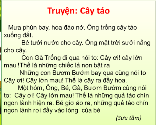 Ông trồng cây táo xuống đất. Bé tưới nước cho cây. Mưa tưới nước cho cây. Mặt trời sưởi ấm cho cây